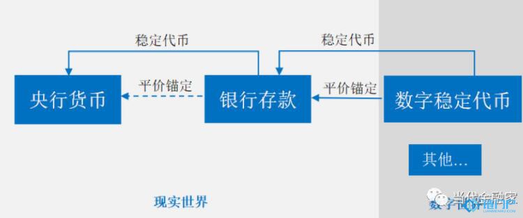 据了解,传统货币有两种形式:央行货币与银行存款。相对应,数字货币可以是央行货币的数字化;亦可以是银行存款的数字化。某种意义上,银行存款其实也是央行货币的“稳定代币”。首先,银行存款虽具有支付功能,但没有计价功能。它们以央行货币计价,最终以央行货币偿付,事实上它们是央行货币的一种延伸性支付安排,是央行货币的“代币”。其次,通过存款准备金、存款保险、央行最后贷款人、央行对银行隐含担保等制度安排,银行存款与央行货币维持平价锚定。所以,基于法币存款抵押的数字稳定代币在平价锚定银行存款的同时,也锚定了央行货币。或许可这么说,数字稳定代币是央行货币的“稳定代币”的“稳定代币”(见下图)。