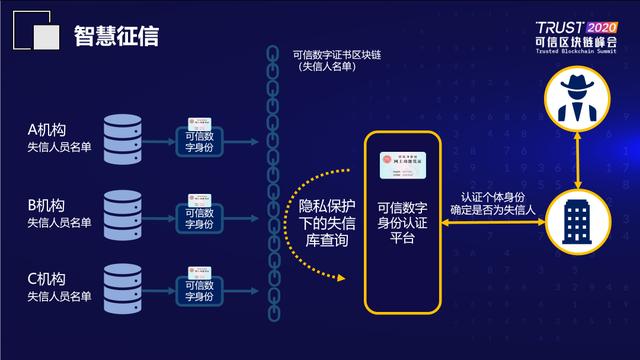 智慧征信:在诚信社会体系的构建方面作出了探索,提出失信人员名单需要公开,但同时也需要考虑失信人员隐私性的观点。借助区块链和可信数字身份技术,最大限度地防止失信人员信息公开的同时,又起到了联合惩戒的作用。