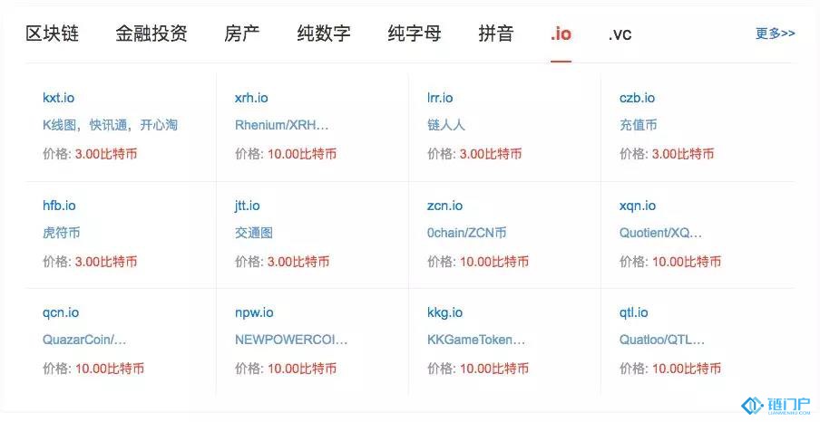 除了“.com”域名,“.org”、“.io”的域名同样受市场追捧。目前在域名商城上,域名中带有“b”、“l”等三字母的“.io”的域名售价大多在3BTC至10BTC之间,价格约为13.5万至45万人民币。