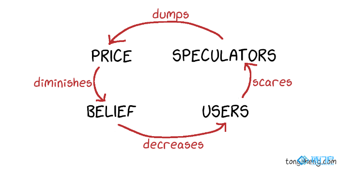 其作用力是这样的:用户和投机者的流失取决于加密货币或区块链项目是否具有实际用途。如果加密货币并没有实际用途,项目只是一个炒作的噱头,则用户在飞轮反作用转动时,流失率极高,当对应的是价格下跌的波动也会极其剧烈。