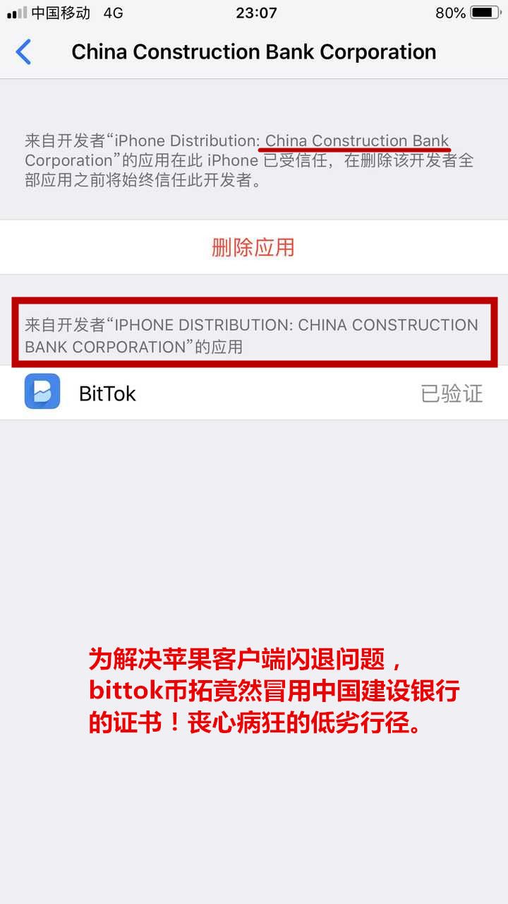 bittok币拓现在竟然冒用中国建设银行的证书来骗取苹果验证,可向建设银行求证或举报。