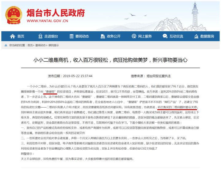 烟台市政府官网曝光与BCHC关联的壹键哥链接:【烟台市政府门户网站 便民提示 小小二维是商机,收入百万很轻松,疯狂抢购做美梦,新兴事物要当心】