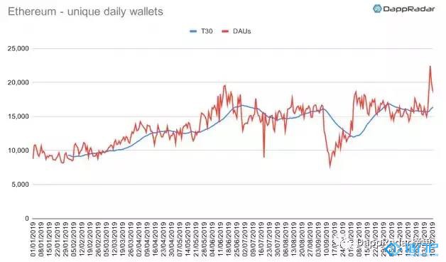 总体数据显示,截至12月中旬,在所有以太坊dapp上每天交互的活跃钱包数量增长了118%,超过1.9万个。