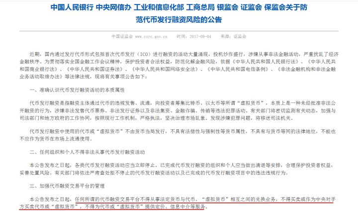 中国明令禁止币拓、币超这类虚拟货币交易平台,明令禁止虚拟货币交易【中国人民银行 中央网信办 工业和信息化部 工商总局 银监会 证监会 保监会关于防范代币发行融资风险的公告】