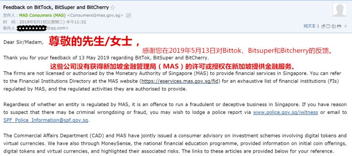 新加坡金融管理局官方回信:bittok、bitsuper、bitcherry均不受监管,无证经营