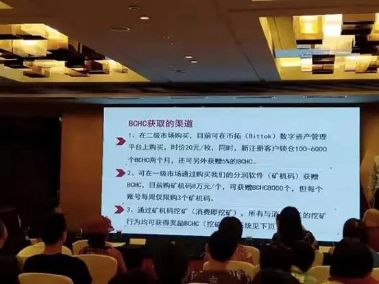 这一天,在广州天河区的希尔顿酒店,另一场名为“BCHC新老会员共识大会”的活动也在开展,与会者听着台上的人宣讲着区块链、特别是BCHC将改变财富分配的梦想。