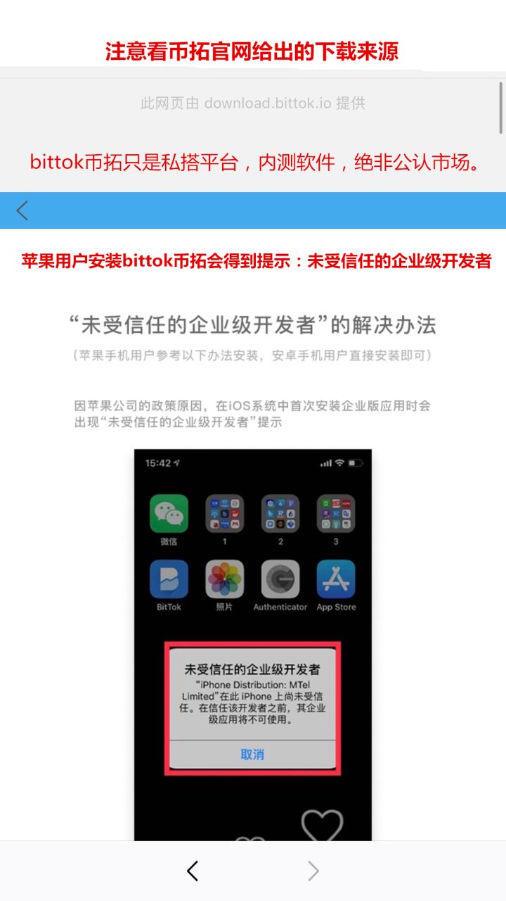 币拓的苹果客户端经常闪退,解决办法竟然是冒用银行证书,骗取验证bittok币拓只是谎称有金融牌照,实际无证经营的境外非法平台。